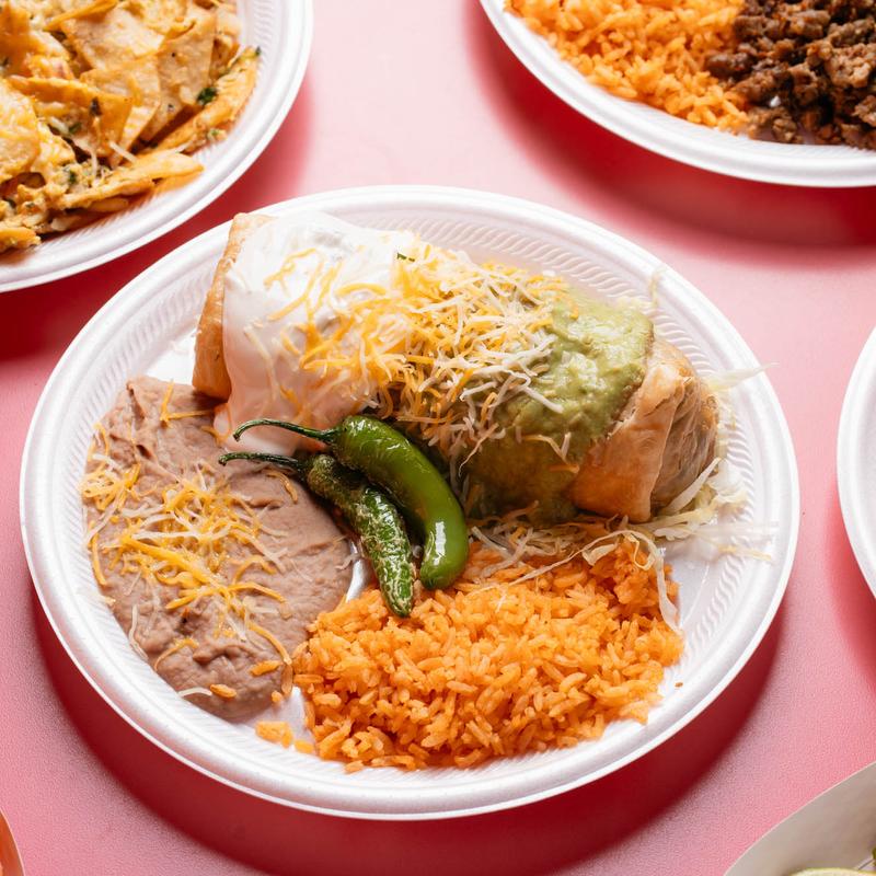 Any meat, guacamole, lettuce, pico de gallo, cream, cheese, rice & beans